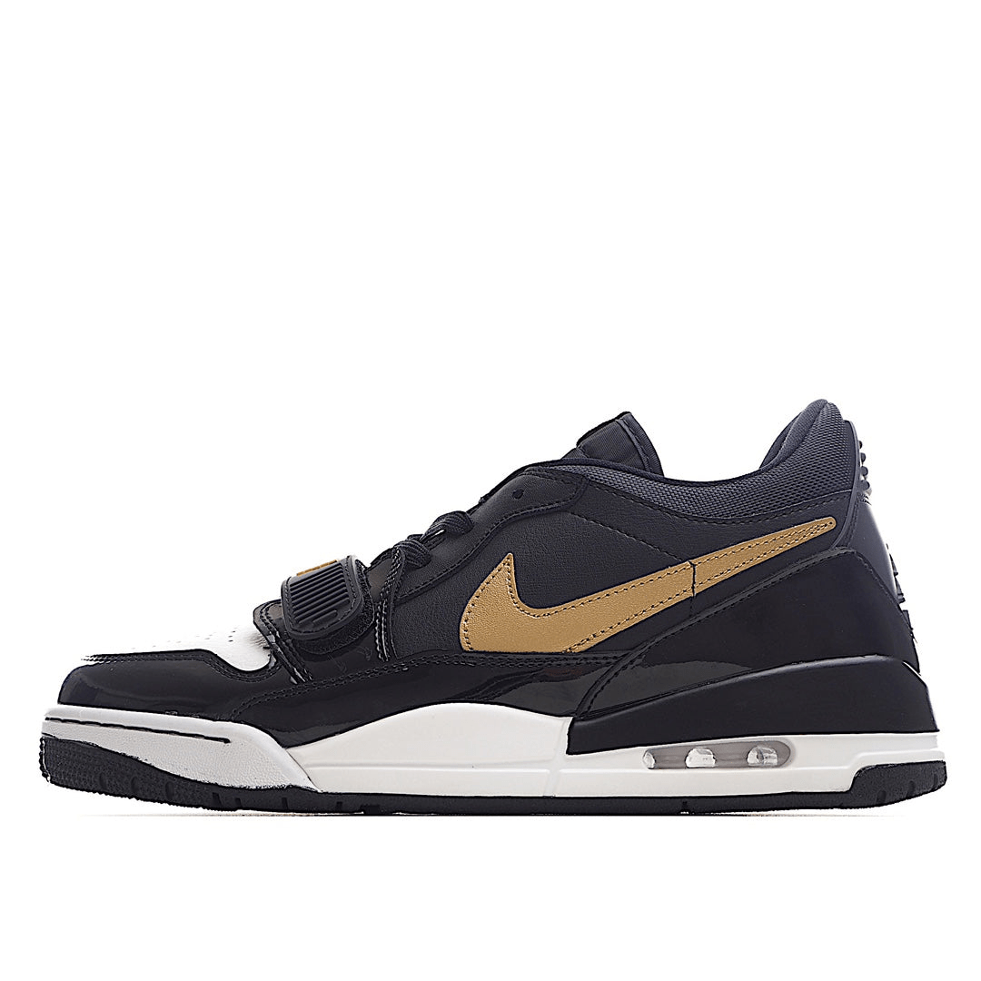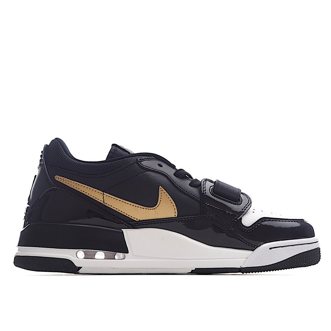 The upper is crafted from high-quality black leather, providing a sleek and sophisticated base. The signature patent leather mudguard, also in black, adds a glossy finish that elevates the shoe??s premium feel. What truly sets this version apart is the eye-catching gold accents, which are featured on the Jumpman logo, lace eyelets, and detailing around the heel. These metallic gold touches add a sense of luxury and elegance to the sneaker, making it stand out from more traditional colorways.