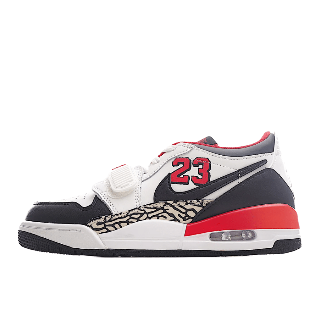 The upper features a clean white leather base, providing a versatile and crisp look. The patent leather mudguard is also white, creating a cohesive and polished appearance. Bold red accents highlight key areas, including the Jumpman logo, the inner lining, and the eyelets, adding a vibrant pop of color that energizes the overall design. Black detailing on the laces and outsole introduces a sharp contrast, enhancing the sneaker??s visual impact and giving it a distinctive edge.