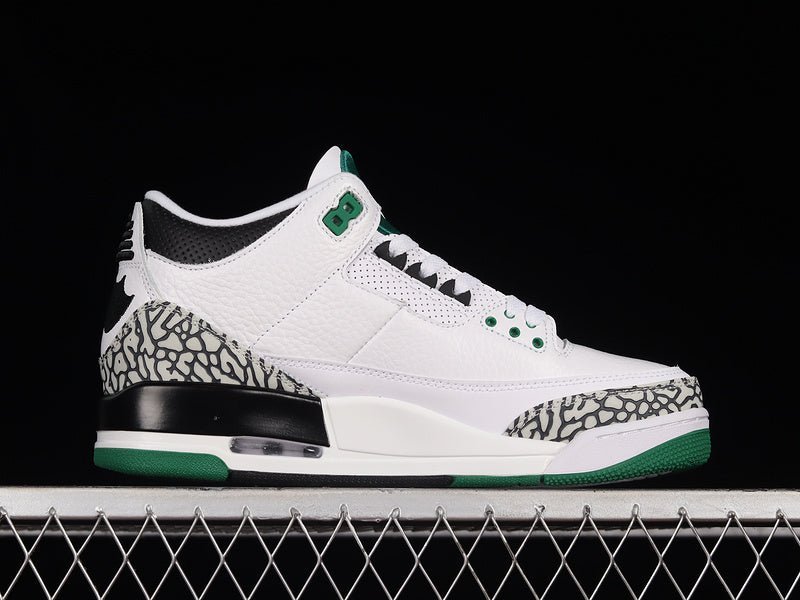 The upper is crafted from high-quality white leather, offering a clean and sophisticated base. This pristine white is complemented by black accents on the midsole, collar, and tongue, creating a striking contrast that enhances the overall aesthetic. The signature elephant print overlays on the toe and heel add texture and depth, staying true to the classic design elements that have made the Air Jordan 3 a beloved icon.